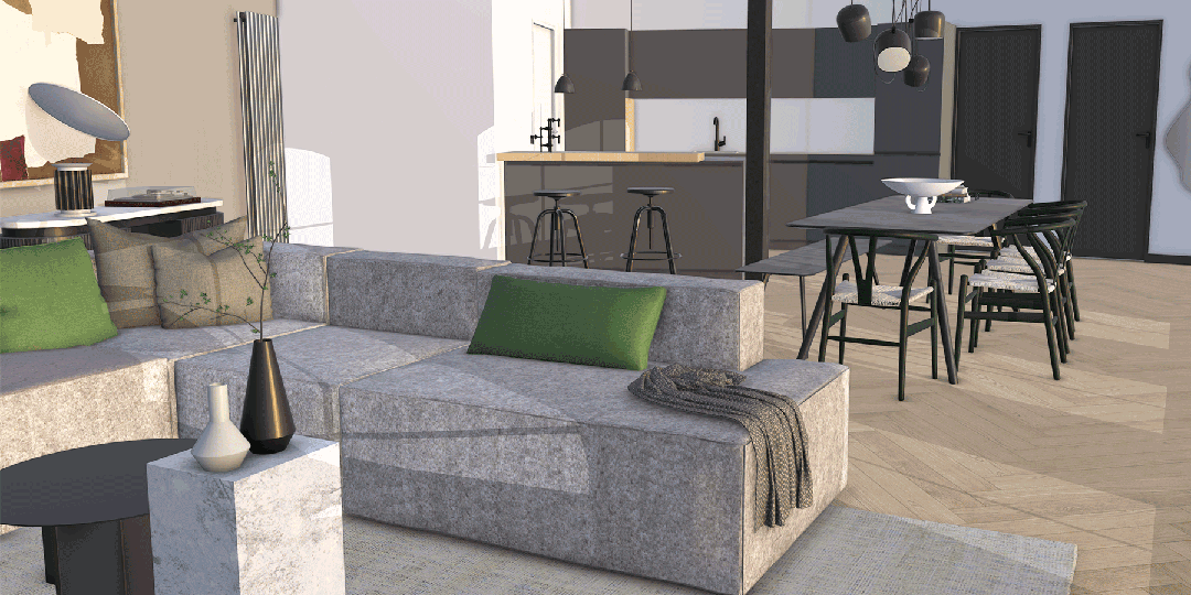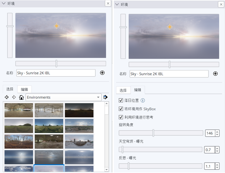 新增【环境】功能通过真实的环境光照营造逼真的氛围,使3D对象在场景中的光影效果更加逼真。环境光照与逼真材质之间能够产生动态的交互作用。 【环境】采用的是360度(HDR或EXR)图像文件,可同时提供背景图像(天空穹顶)和光源,而【逼真材质】则会相应地进行反射。