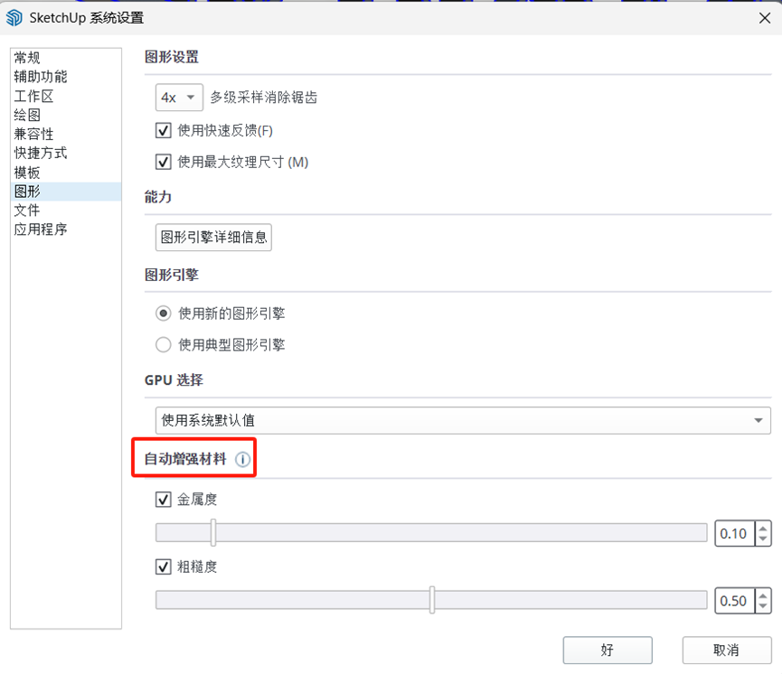 自动增强材料 如果你的模型中有很多“非真实”材质,打开“自动增强材料”设置,可以让这些材质动态地对环境做出反应,自动生成金属度和粗糙度的值。