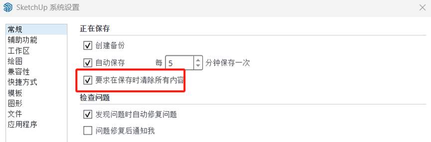 ![]() 在未接收基本PBR属性(右侧)的情况下,启用逼真材质时,纹理看起来会相对平淡。 保存时提醒“清除未使用资源” 由于包含PBR贴图的逼真材质会导致文件量显著增大,随着模型中未使用的资源逐渐增多,清除不需要的资源变得越来越重要。SketchUp现针对这些未使的资源提供了一个可选项,保存时您可以选择是否清除或保留它们,也可以随时通过搜索SketchUp激活“清除未使用资源”。 ![]() 设置保存时是否接收未使用的资源提醒 新增环境效果